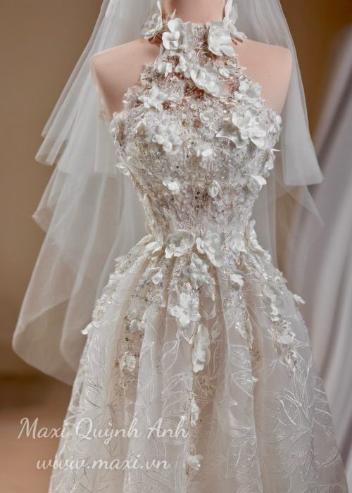 👰 Form dáng A-line (chữ A) mềm mại, ôm nhẹ phần eo và xòe dần xuống dưới, tạo cảm giác thướt tha và thanh thoát. Điểm nhấn nổi bật là thiết kế cổ yếm cao đầy kiêu sa và thanh lịch, giúp tôn lên bờ vai thon thả và vẻ đẹp cổ điển.