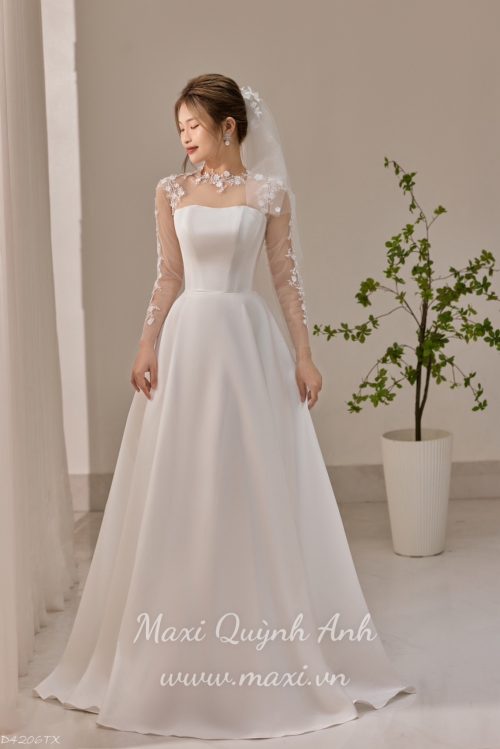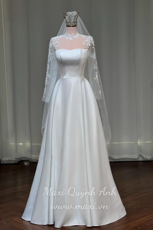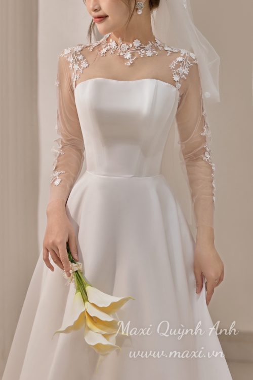 Váy có phom dáng chữ A (A-line) với phần thân trên ôm vừa phải và phần chân váy xòe nhẹ nhàng, tạo sự thướt tha và duyên dáng. Chiều dài váy chạm đất. Điểm nhấn đặc biệt là phần cổ và tay áo được làm từ vải sheer (vải mỏng xuyên thấu), tạo cảm giác nửa kín nửa hở rất tinh tế. Cổ váy được thiết kế cao, tròn, trên nền vải voan mỏng được đính các chi tiết hoa ren 3D nhỏ xinh xắn, tạo vẻ trang nhã và sang trọng. Tay áo dài, cũng được đính các họa tiết hoa ren chạy dọc theo tay, tạo sự liền mạch và hài hòa với phần cổ váy. Phần thân trên bên trong được thiết kế cúp ngực, ôm sát, tôn lên vóc dáng của cô dâu.