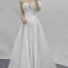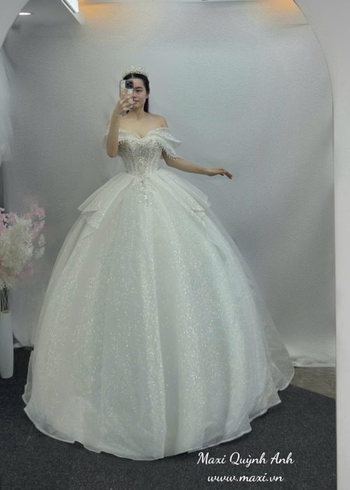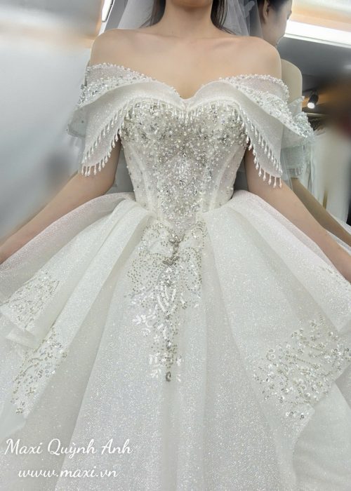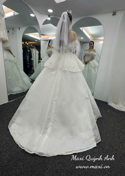 Váy cưới dáng công chúa (ball gown), với phần tùng váy xòe bồng bềnh, tạo cảm giác lộng lẫy và cổ điển. Cổ áo dáng trễ vai (off-shoulder), giúp khoe khéo bờ vai thon gọn của cô dâu.