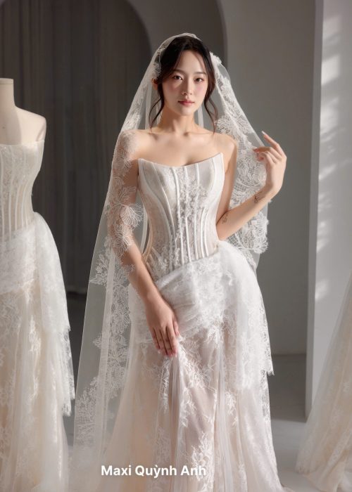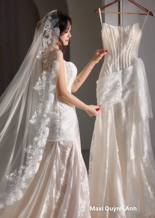 Phom váy, các đường gân nổi chạy dọc thân giúp định hình vóc dáng, làm nổi bật vòng eo và phần ngực. Chất liệu ren xuyên thấu kết hợp với lớp lót nude, tạo hiệu ứng gợi cảm nhưng vẫn tinh tế, sang trọng. Chi tiết ren hoa nổi được đính thủ công tinh xảo trải dọc thân váy, mang lại sự mềm mại và lãng mạn. Đi kèm voan dài ren phủ tạo cảm giác kiêu sa, làm tổng thể váy thêm hoàn hảo cho ngày cưới.Tổng thể, đây là chiếc váy mang vẻ đẹp quyến rũ, sang trọng và hiện đại, cực kỳ phù hợp cho cô dâu muốn vừa lộng lẫy vừa gợi cảm trong lễ cưới.