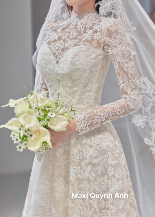 Toàn bộ chiếc váy được bao phủ bởi lớp ren cao cấp với họa tiết hoa lá mềm mại và những đường hoa văn uốn lượn tinh tế, tạo nên một tổng thể hài hòa và quyến rũ. Thiết kế cổ cao vừa phải và tay dài kín đáo được làm từ ren xuyên thấu, khoe trọn vẻ đẹp thanh thoát của bờ vai và cánh tay.