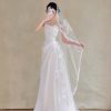 Điểm nhấn đặc biệt là chiếc khăn voan dài được viền ren đồng điệu với váy, tạo nên vẻ đẹp cổ điển, sang trọng và hoàn thiện vẻ ngoài thanh lịch, tinh khôi của cô dâu.
