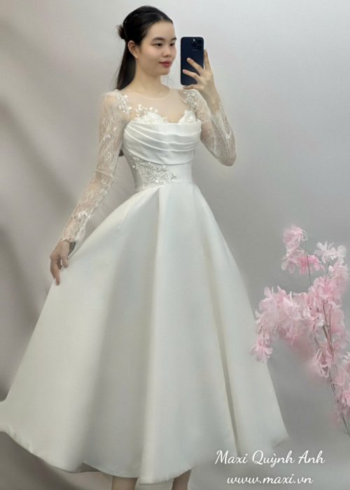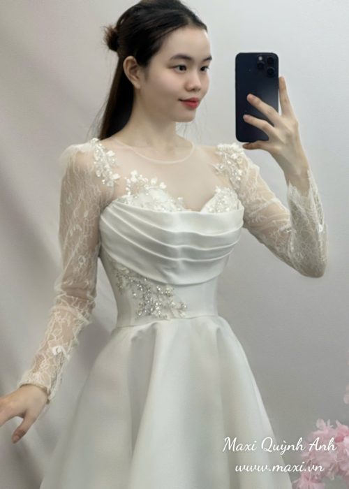 Váy thiết kế tay dài ren trong suốt ôm nhẹ, mang đến cảm giác kiêu kỳ nhưng không kém phần ngọt ngào. Phần ngực xếp ly tinh tế kết hợp cùng form váy A xòe nhẹ giúp che khuyết điểm và tôn vòng eo thon gọn. Chất liệu lụa cao cấp có độ bóng nhẹ, mềm mại, tạo dáng váy đứng form hoàn hảo trong từng bước di chuyển.