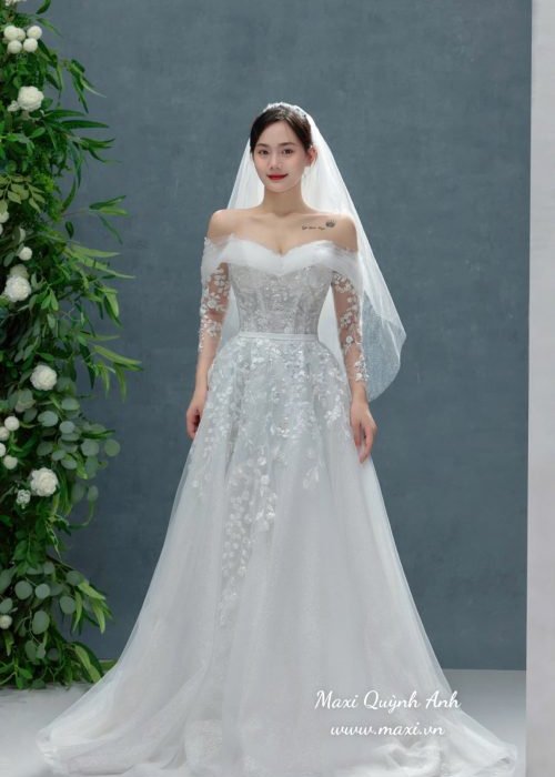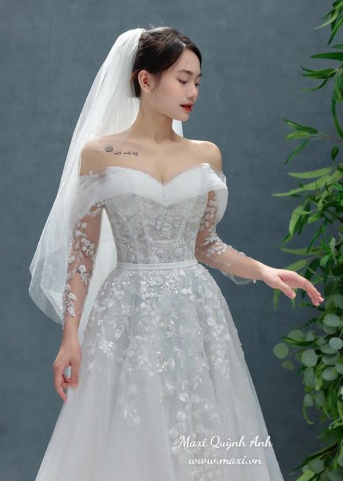Với chiếc váy cưới có phom dáng xòe nhẹ nhàng, tạo vẻ đẹp thanh lịch và bay bổng. Phần trên váy là kiểu trễ vai gợi cảm, kết hợp với tay áo dài bằng ren hoa tinh xảo, tạo sự quyến rũ mà vẫn kín đáo. Thân váy được trang trí bằng các họa tiết ren và hoa 3D tinh tế, trải dài từ phần eo xuống chân váy, tạo cảm giác mềm mại. Chiếc váy được làm từ nhiều lớp vải tuyn hoặc voan mỏng nhẹ, mang đến độ bồng bềnh tự nhiên và thướt tha. Với thiết kế này, chiếc váy là sự kết hợp hoàn hảo giữa nét cổ điển và hiện đại, tôn lên vẻ đẹp dịu dàng và lãng mạn của cô dâu.