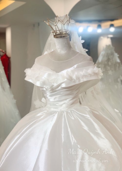 Điểm nhấn độc đáo là thiết kế trễ vai với lớp bèo nhún bồng bềnh, tạo cảm giác nhẹ nhàng, lãng mạn như cánh hoa. Váy cũng có một lớp vải voan mỏng ở phần cổ áo, mang lại sự kín đáo tinh tế. Tùng váy xòe lớn với nhiều lớp vải giúp váy có độ phồng tự nhiên, thướt tha khi di chuyển. Tổng thể, chiếc váy là sự kết hợp hoàn hảo giữa nét kiêu sa, cổ điển và sự nữ tính, rất phù hợp cho ngày cưới trọng đại.