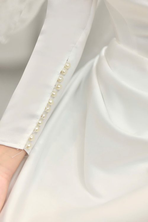 Thiết kế đơn giản nhưng tinh tế, chiếc váy không sử dụng các chi tiết ren, đính kết cầu kỳ mà tập trung vào phom dáng và chất liệu. Sự tối giản này chính là điểm nhấn, mang đến vẻ đẹp thanh lịch và sang trọng vượt thời gian.