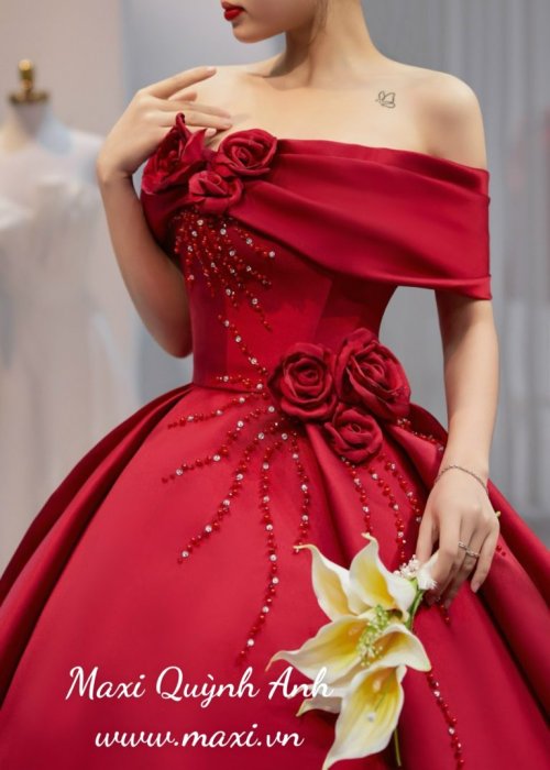 Váy Cưới Trễ Vai Hoa Đỏ