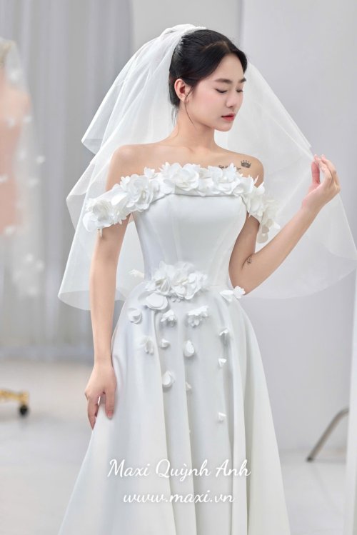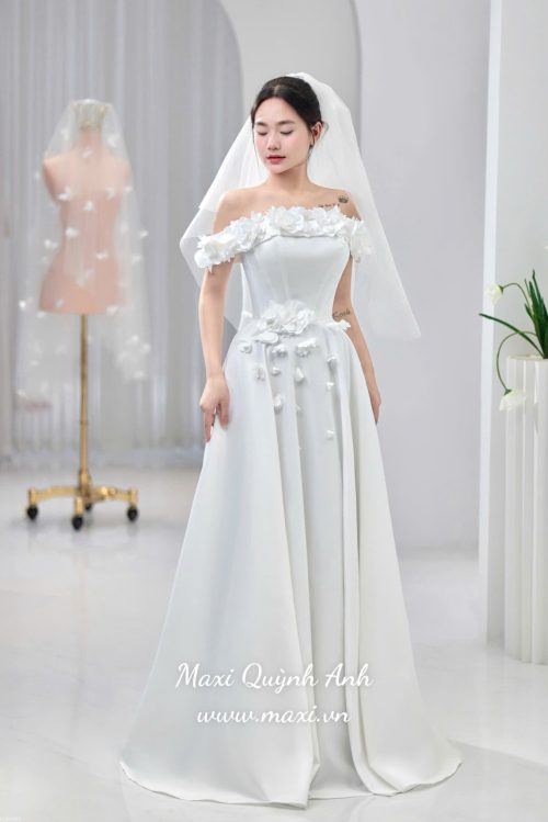 Váy Cưới Trễ Vai Hoa Nổi 3D Tao Nhã