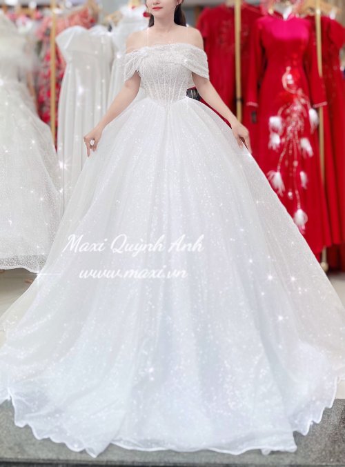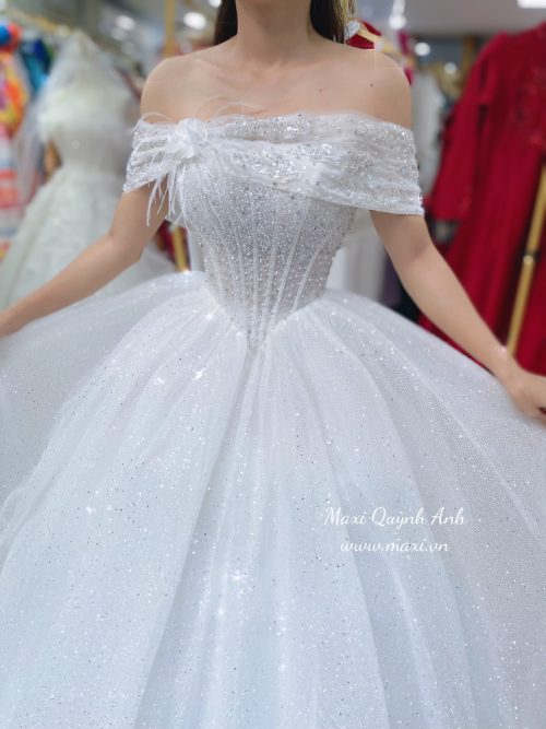 Váy Cưới Trễ Vai Kim Sa Cao Cấp