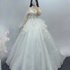 Chiếc váy có phom dáng công chúa xòe bồng bềnh, phần thân áo corset ôm sát ngực và eo, tạo hiệu ứng thon gọn. Chất liệu chủ yếu là voan lưới mềm mại, được phủ lớp kim tuyến lấp lánh toàn bộ váy, kết hợp với các chi tiết đính kết đá hoặc pha lê ở phần thân áo.