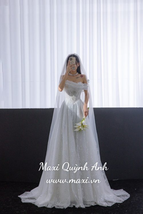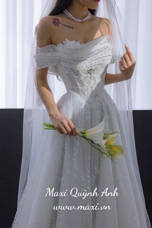 Váy Cưới Trễ Vai Kim Sa Nhẹ Nhàng