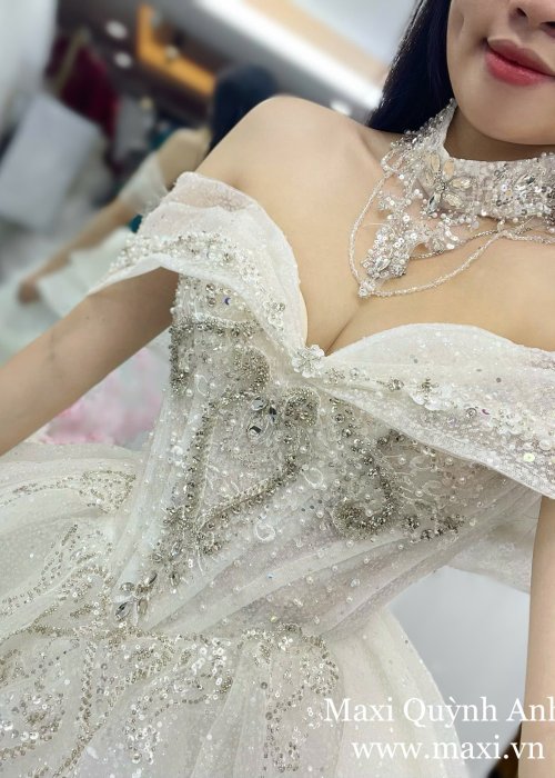 Lấy cảm hứng từ vẻ đẹp lộng lẫy và quyền quý, mẫu váy cưới trễ vai đính kim sa cao cấp mang đến hình ảnh một nàng dâu kiêu sa, toả sáng như nữ hoàng trong ngày trọng đại. Thiết kế trễ vai tinh tế giúp khoe trọn bờ vai mềm mại, kết hợp cùng phần corset ôm eo tôn dáng tối đa.