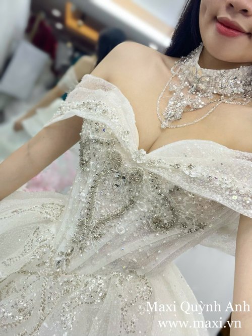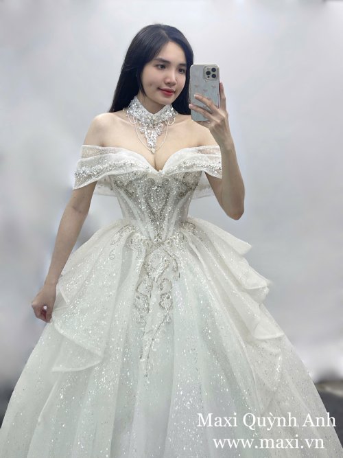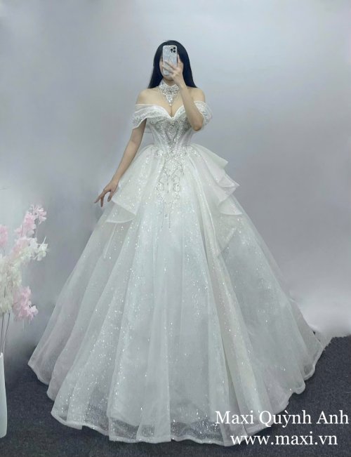 Lấy cảm hứng từ vẻ đẹp lộng lẫy và quyền quý, mẫu váy cưới trễ vai đính kim sa cao cấp mang đến hình ảnh một nàng dâu kiêu sa, toả sáng như nữ hoàng trong ngày trọng đại. Thiết kế trễ vai tinh tế giúp khoe trọn bờ vai mềm mại, kết hợp cùng phần corset ôm eo tôn dáng tối đa.