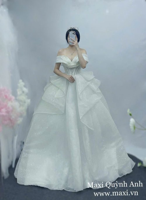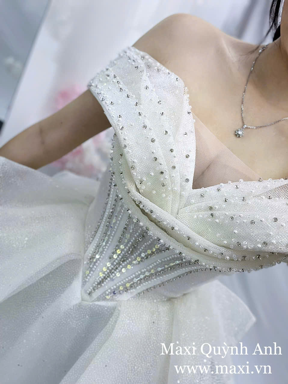 Chiếc váy cưới mang đến vẻ đẹp ngọt ngào và quyến rũ nhờ thiết kế trễ vai tinh tế, tôn trọn bờ vai mềm mại của nàng dâu. Chất liệu kim sa lấp lánh được xử lý khéo léo, bắt sáng hoàn hảo dưới ánh đèn, giúp cô dâu trở thành tâm điểm trong từng khoảnh khắc.