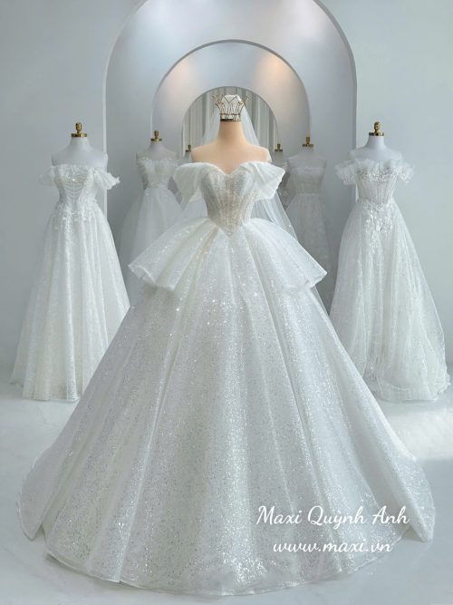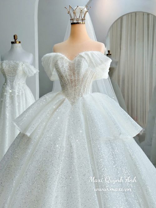 Váy Cưới Trễ Vai Kim Sa Tùng Xòe Sang Trọng