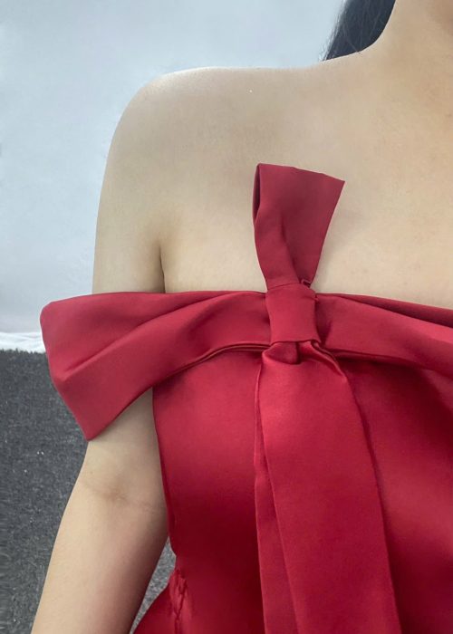Điểm nhấn đặc biệt của thiết kế là phần vai trần gợi cảm, khéo léo khoe xương quai xanh mảnh mai. Phần thân trên ôm sát, tôn lên vòng eo thon gọn, trong khi chân váy xòe bồng bềnh tự nhiên, tạo cảm giác bay bổng, uyển chuyển. Đặc biệt, chi tiết nơ lớn được đính kết tinh xảo ở vai không chỉ là điểm nhấn độc đáo mà còn thể hiện sự nữ tính, lãng mạn. Chiếc nơ được tạo dáng tinh tế, không quá cầu kỳ nhưng vẫn đủ sức thu hút mọi ánh nhìn.