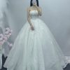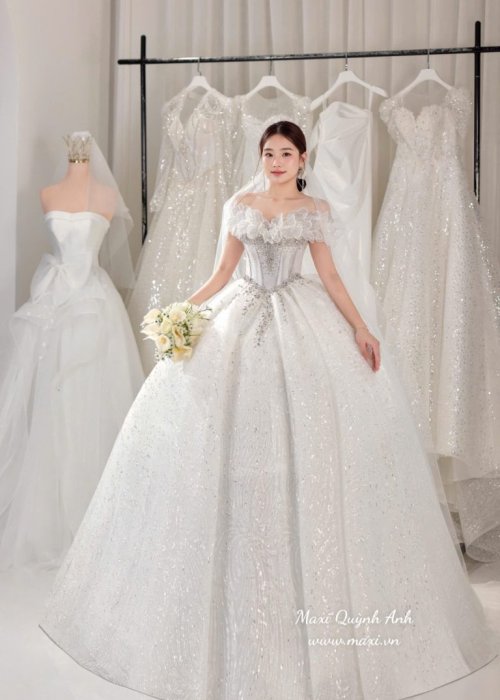 Kiểu dáng công chúa lộng lẫy: Đây là một chiếc váy cưới dáng công chúa (ball gown) với phần tùng váy xòe cực đại, tạo sự hoành tráng và lộng lẫy, biến cô dâu thành tâm điểm của mọi ánh nhìn. Thân áo corset tinh xảo, thân áo được thiết kế theo kiểu corset, ôm sát, giúp tôn lên vòng eo thon gọn. Phần thân này được đính kết vô cùng cầu kỳ với các chi tiết lấp lánh như hạt cườm, pha lê, và ren thêu 3D, tạo hiệu ứng tỏa sáng rực rỡ. Cổ áo trễ vai mềm mại, thiết kế trễ vai (off-shoulder) với chi tiết bèo nhún hoặc xếp ly nhẹ nhàng. Phần tùng váy không chỉ có độ phồng lớn mà còn được phủ một lớp kim tuyến hoặc hạt lấp lánh, tạo hiệu ứng “bầu trời sao” khi ánh sáng chiếu vào. Đây là một điểm nhấn đặc biệt, mang lại vẻ đẹp huyền ảo và cuốn hút cho cô dâu.