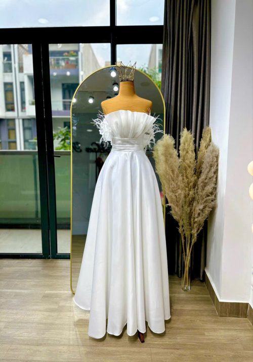 Váy Cưới Trễ Vai Phối Lông Vũ Nhẹ Nhàng