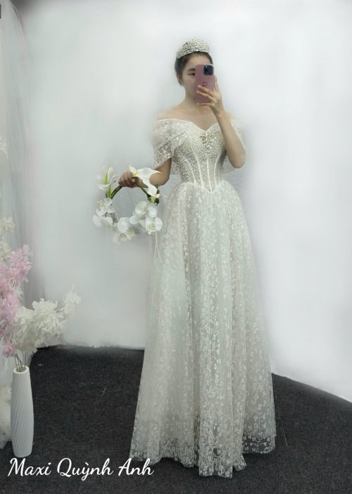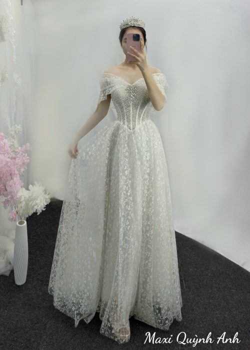 Váy Cưới Trễ Vai Ren Hoa 2025 – Thanh Lịch, Duyên Dáng Ngày Trọng Đại