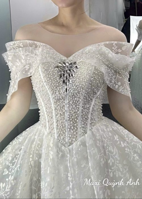 Chiếc váy cưới được thiết kế dáng dài thướt tha với phần trễ vai quyến rũ, giúp tôn bờ vai mềm mại và vóc dáng thanh thoát của cô dâu. Phần thân váy được đính hạt ngọc trai tinh xảo, tạo hiệu ứng lấp lánh sang trọng, kết hợp chi tiết cúp ngực ôm vừa vặn, giúp tôn vòng eo gọn gàng.