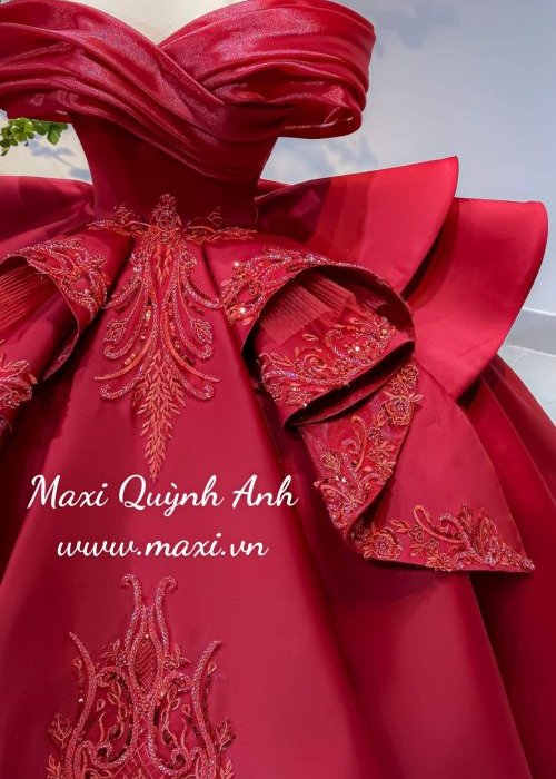Váy Cưới Trễ Vai Ren Tùng Đỏ Cao Cấp