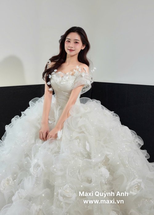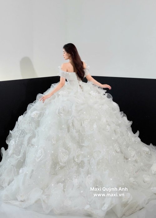 Phần thân trên ôm sát dáng corset, khéo léo tôn vòng eo thon gọn, kết hợp với thiết kế trễ vai nhẹ nhàng mang lại vẻ đẹp ngọt ngào và quyến rũ. Điểm nhấn nằm ở những bông hoa nổi 3D đính thủ công trên vai và ngực áo, vừa tinh tế vừa sang trọng.