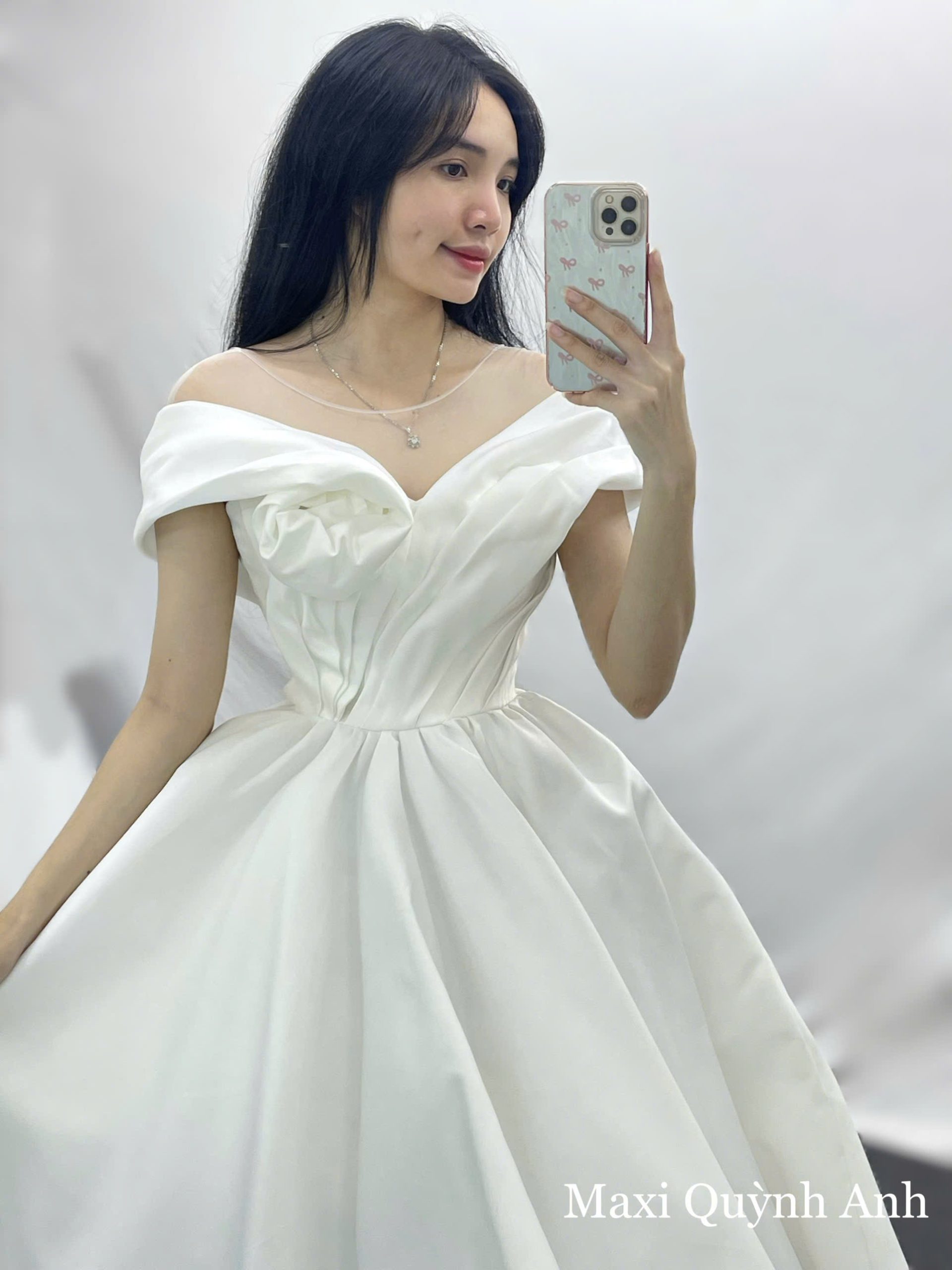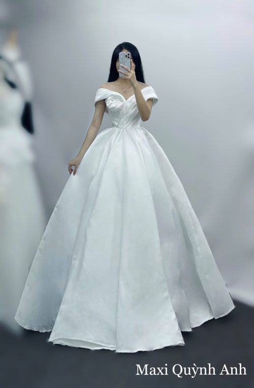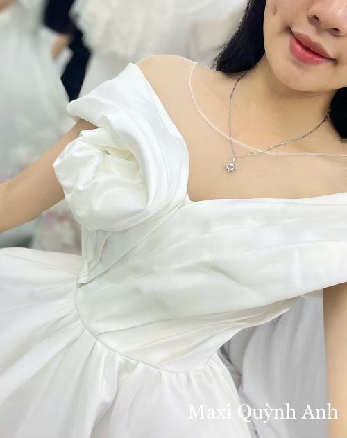Chiếc váy cưới này là hiện thân của vẻ đẹp thuần khiết và lãng mạn, mang đến phong cách cổ điển mà vẫn rất hiện đại. Điểm nhấn đầu tiên là phần cổ áo trễ vai, được tạo hình từ chất liệu lụa phi Hàn bóng nhẹ, mang đến vẻ ngoài sang trọng và tinh tế. Phần ngực áo được xếp nếp một cách khéo léo, tạo hình một bông hoa 3D mềm mại, vừa nữ tính vừa quyến rũ. Thân áo corset được thiết kế ôm sát, với đường nếp gấp tinh tế, giúp tôn lên vòng eo thon gọn. Chân váy xòe bồng với chất liệu phi cao cấp đứng phom, tạo sự lộng lẫy và kiêu sa, biến cô dâu thành tâm điểm của mọi ánh nhìn.