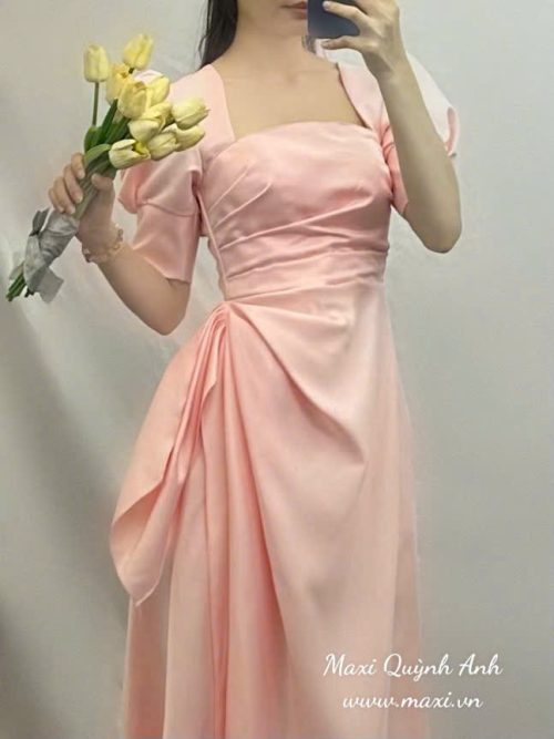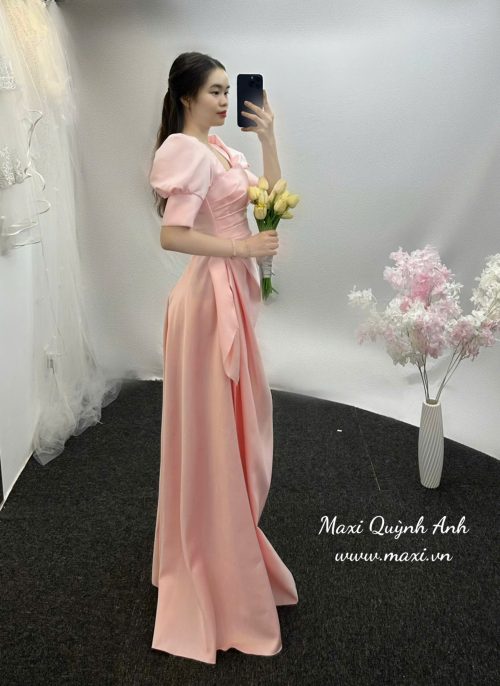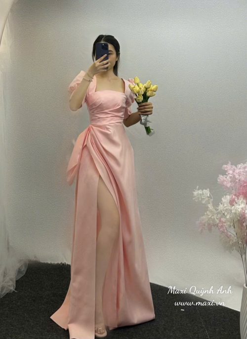 Váy Dạ Hội Hồng Nhấn Eo Xẻ Tà