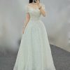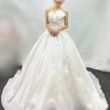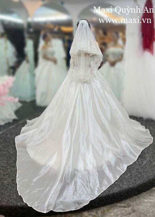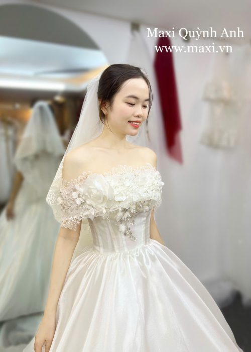 Thiết kế của chiếc váy mang phong cách trang trọng. Phần thân trên được thiết kế cúp ngực đầy quyến rũ, kết hợp cùng dáng trễ vai làm bằng vải voan xếp nhún mềm mại. Thân áo ôm sát được thêu đính kim sa và đá lấp lánh, tạo điểm nhấn nổi bật. Chân váy xòe bồng bềnh, được làm từ nhiều lớp vải voan organza có độ bóng nhẹ, tạo hiệu ứng lung linh, lãng mạn. Chiếc váy này không chỉ đẹp lộng lẫy mà còn mang đến vẻ đẹp thanh thoát, giúp mình tự tin tỏa sáng như một nàng công chúa thực thụ. 💖👰♀️
