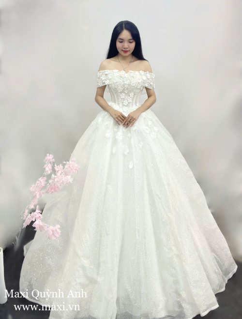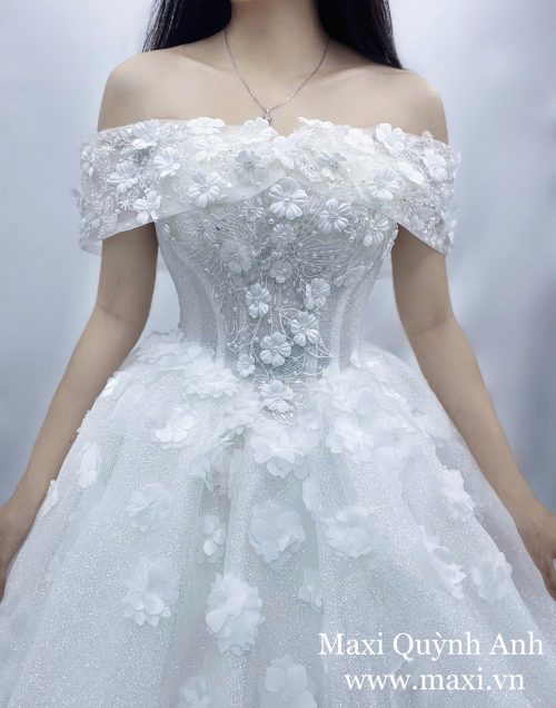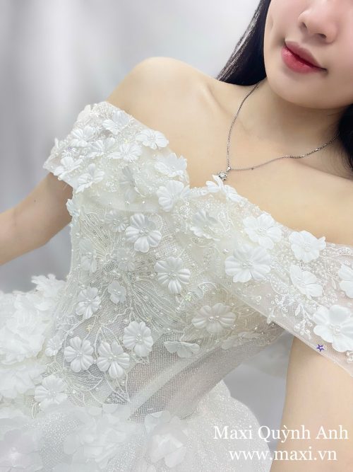 Chiêm ngưỡng vẻ đẹp ngọt ngào và tinh tế của thiết kế váy cưới mới nhất tại cửa hàng. Phần thân trên được thiết kế dáng trễ vai duyên dáng, khoe trọn bờ vai mềm mại và xương quai xanh quyến rũ. Điểm nhấn đặc biệt là những bông hoa 3D được đính kết thủ công tỉ mỉ trên khắp phần ngực và vai, tạo nên vẻ đẹp vừa hiện đại vừa lãng mạn.
