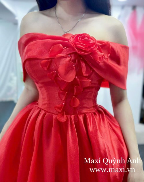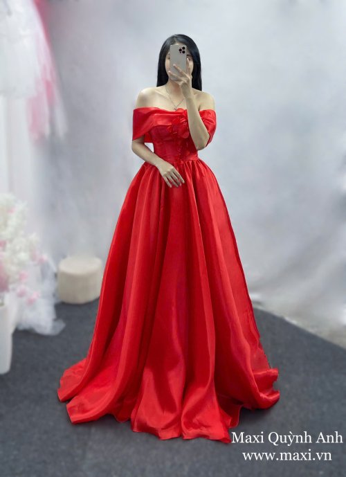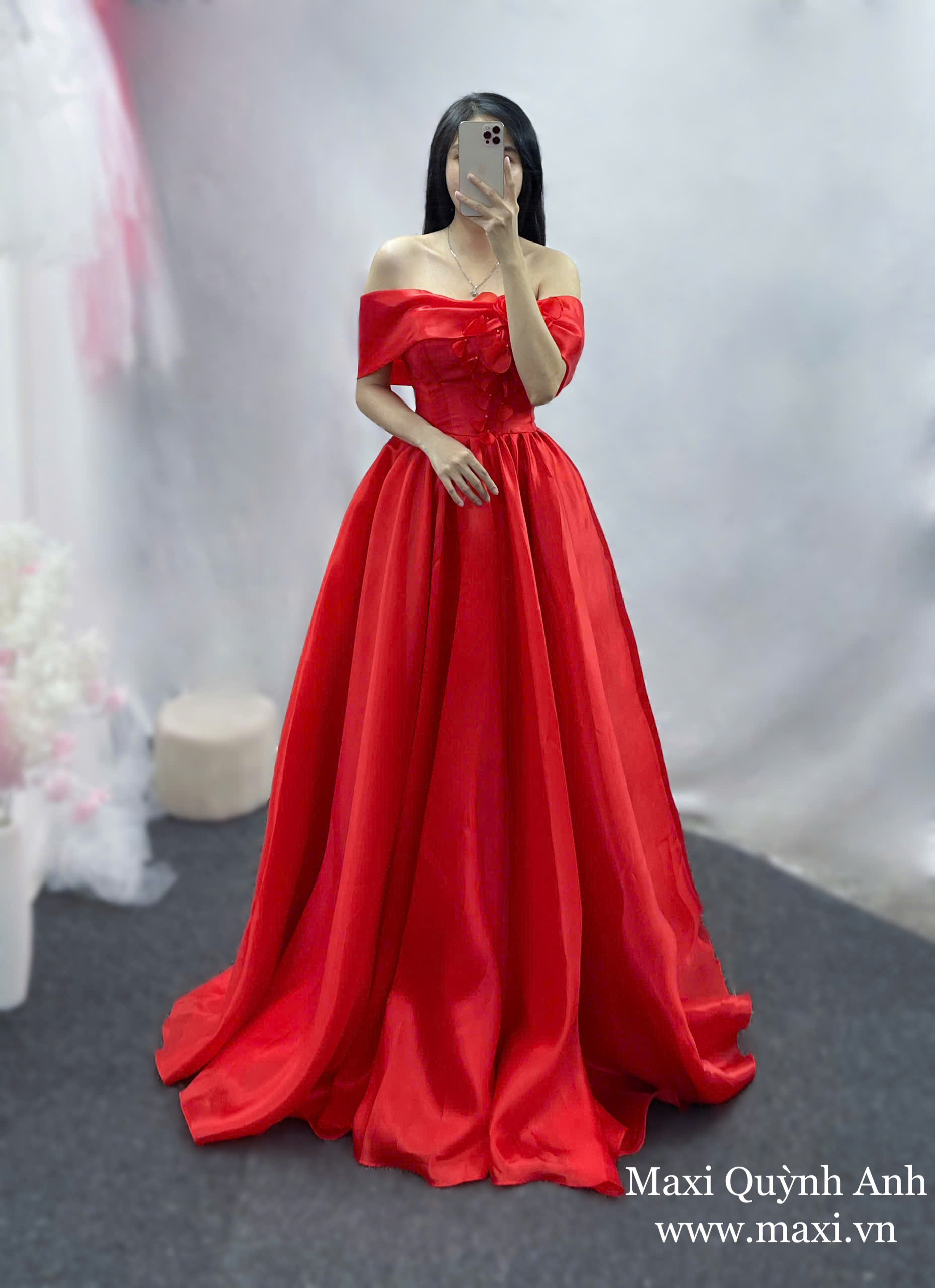 Mộ chiếc váy cưới có form dáng xòe phồng chữ A, mang vẻ đẹp lộng lẫy và cổ điển. Sắc đỏ rực rỡ của váy tạo sự nổi bật và cuốn hút mạnh mẽ. Váy có thiết kế trễ vai tinh tế, kết hợp với phần thân áo xếp nếp ngang ôm sát, giúp tôn lên vòng eo thon gọn.