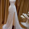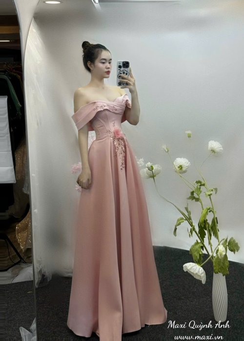 Điểm nhấn độc đáo nằm ở phần thân váy, với họa tiết hoa 3D và những đường thêu đính kim sa, đá lấp lánh chạy dọc một bên eo, tạo sự bất đối xứng và tinh tế. Chất liệu chính là vải phi Hàn cao cấp, có độ bóng mờ, giúp váy đứng form và mang lại vẻ sang trọng. Đây là một mẫu váy lý tưởng cho những bữa tiệc hoặc sự kiện quan trọng, giúp người mặc trở nên duyên dáng và nổi bật.