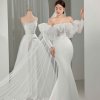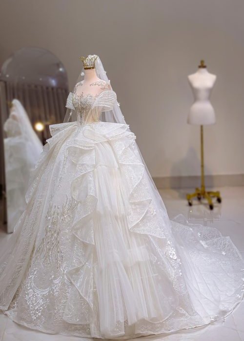Thiết kế cúp ngực hình tim gợi cảm kết hợp trễ vai bồng bềnh, giúp khoe trọn bờ vai thanh mảnh và quyến rũ. Phần eo được chiết cao, ôm sát cơ thể, giúp tôn lên vóc dáng thanh thoát của người mặc. Chất liệu kim sa sang trọng được sử dụng cho phần tùng váy, mang lại độ bồng bềnh tự nhiên và sự thướt tha khi di chuyển. Đây là một mẫu váy lý tưởng cho những cô dâu yêu thích vẻ đẹp lãng mạn, sang trọng và muốn tỏa sáng như một nàng công chúa trong ngày trọng đại.