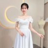 Một chiếc váy lễ là sự kết hợp hoàn hảo giữa vẻ đẹp cổ tích và sự lộng lẫy hiện đại, với form dáng xòe phồng công chúa bồng bềnh và kiêu sa. Sắc trắng tinh khôi của váy được tô điểm bởi những hạt kim sa lấp lánh phủ khắp thân và tùng váy, tạo hiệu ứng tỏa sáng rực rỡ dưới ánh đèn.