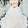 Ánh mắt mọi người đều hướng về – nàng dịu dàng trong tà áo dài cưới trắng tinh khôi, điểm xuyết những hạt ngọc trai óng ánh.