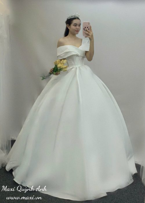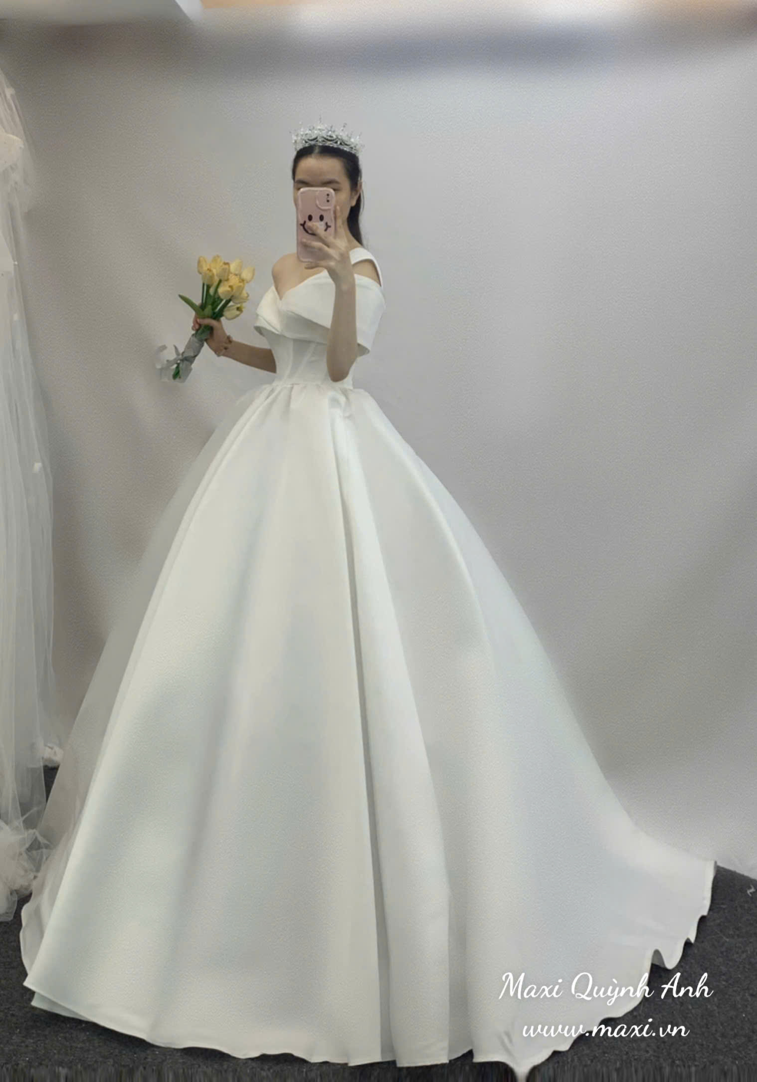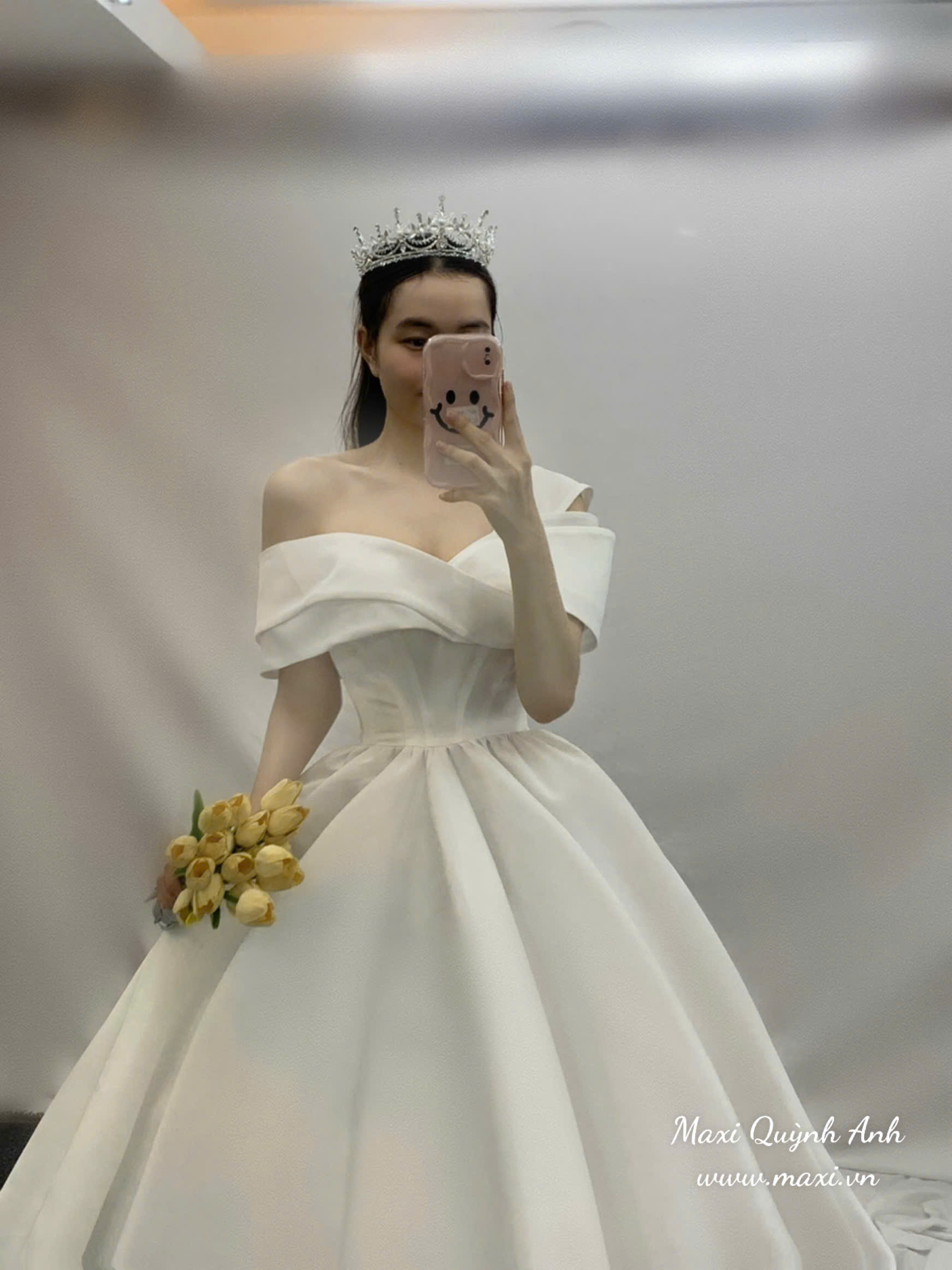 Chiếc váy cưới sở hữu phom dáng công chúa cổ điển với phần trễ vai bản rộng ôm nhẹ, khoe trọn bờ vai thanh thoát. Thân trên ôm sát tôn vòng eo nhỏ, mở ra chân váy xòe phồng cực đại mang lại sự hoành tráng và ấn tượng ngay từ ánh nhìn đầu tiên. Chất liệu vải trắng trơn dày dặn nhưng rủ mượt giúp từng nếp váy đứng form hoàn hảo, tạo cảm giác sang trọng và quyền quý. Đây là lựa chọn lý tưởng cho cô dâu muốn xuất hiện đầy tự tin và nổi bật như một nàng công chúa giữa buổi tiệc.