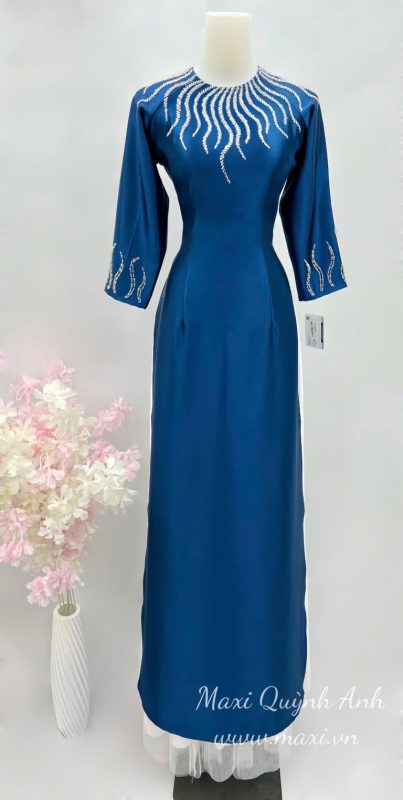 Điểm nhấn đặc biệt của mẫu áo dài này là phần đính đá tinh xảo, được làm thủ công từng viên đá nhỏ lấp lánh trên nền vải cao cấp như lụa, nhung hoặc ren nhập khẩu. Đá đính thường được bố trí ở phần cổ, ngực và tay áo, tạo hiệu ứng lung linh dưới ánh đèn, giúp bà sui hoặc quý cô trung niên nổi bật nhưng không quá phô trương.