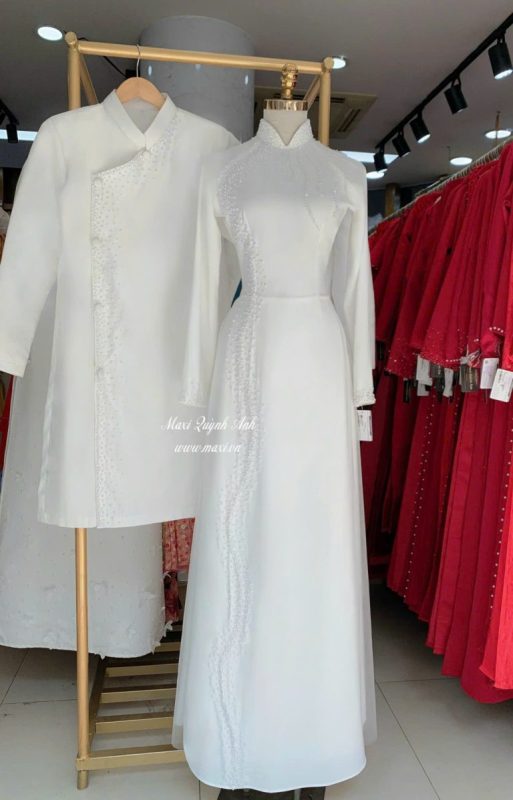 Năm 2025 là năm bùng nổ của các mẫu áo dài cưới kết ngọc. Những viên ngọc trai, ngọc trai Swarovski hoặc ngọc nhân tạo cao cấp được kết thủ công lên thân áo hoặc phần tay tạo hiệu ứng sang trọng, tôn vinh nét quý phái. Maxi Quỳnh Anh là một trong những shop tiên phong với bộ sưu tập áo dài cưới kết ngọc mang lại vẻ đẹp vừa cổ điển vừa đẳng cấp cho cô dâu.