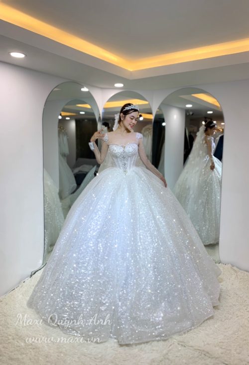 Hãy đến ngay Maxi Quỳnh Anh để chiêm ngưỡng và trải nghiệm sự lộng lẫy của tuyệt tác này! Chúng tôi cam kết mang đến chiếc váy cưới trong mơ của bạn.