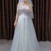 Cổ áo illusion (cổ lưới trong suốt) được đính kết hạt cườm nhỏ li ti, tạo hiệu ứng “sương sa” thanh thoát. Đặc biệt nhất là chi tiết vai trễ (Off-the-shoulder) được trang trí bằng hàng tua rua (fringe) lấp lánh từ chuỗi cườm pha lê, tạo hiệu ứng chuyển động uyển chuyển, hút mắt khi cô dâu di chuyển.