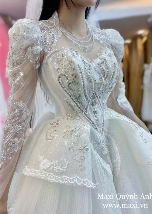 Với thiết kế tinh xảo và chất liệu cao cấp, chiếc váy này sẽ giúp bạn tự tin tỏa sáng. Hãy đến với Maxi Quỳnh Anh để trải nghiệm sự lộng lẫy này và tìm thấy chiếc váy cưới của cuộc đời mình.